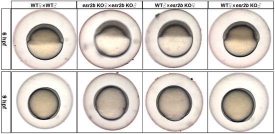The developmental delay of esr2b knockout zebrafish. The developmental situation of zebrafish embryos was observed and photographed at 6 hpf and 9 hpf, respectively. All embryos from different zebrafish lines were collected and randomly transferred into Petri dishes (30/each).