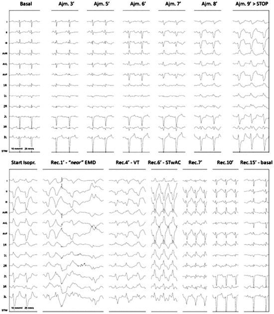 Positive Ajmaline challenge inducing ventricular tachycardia. Ajm—ajmaline; EMD—electromechanical dissociation; Isopr—isoproterenol; Rec.—post ajmaline recuperation; STwAC—sinus tachycardia with aberrant conduction; VT—ventricular tachycardia.