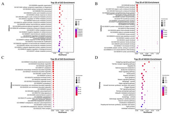 Gene Ontology (GO) and Kyoto Encyclopedia of Genes and Genomes (KEGG) enrichment. (A–C) GO enrichment analysis of biological processes, molecular functions, and cellular components. (D) KEGG enrichment of differentially expressed genes.