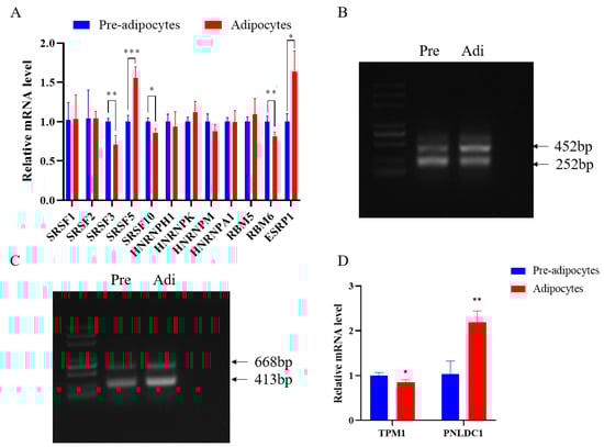 To further validate the accuracy of the sequencing and prediction data, we examined the expression of the alternative splicing factor SRSF gene family, RBM gene family and HNRNP gene family before and after adipocyte differentiation. Significant differences were found in the SRSF3, SRSF5, SRSF10, RBM6 and ESRP1 genes (Figure 4A). Following this, we validated tropomyosin 1 (TPM1) and PARN like ribonuclease domain containing exonuclease 1 (PNLDC1) by PCR and RT-qPCR. TPM1 has three transcripts, the long transcript is expressed at a lower level in pre-adipocytes, and PNLDC1 also has two transcripts, both of which are expressed at a higher level in adipocytes. (Figure 4C). RT-qPCR results showed that the expression of TPM1 decreased after adipocyte differentiation, and the expression of PNLDC1 increased after adipocyte differentiation. The results show that, consistent with the sequencing results, TPM1 and PNLDC1 incidence differential variable shearing during adipocyte differentiation.