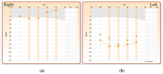 Audiometry demonstrating normal hearing on the right side (a) and unilateral sensorineural hearing loss on the left side (b). Squares indicate masked air-conduction thresholds, circles (right ear) and crosses (left ear) indicate unmasked air-conduction thresholds. The vertical axis shows the degree of hearing loss in decibels [dB], and the horizontal axis shows the frequency range.