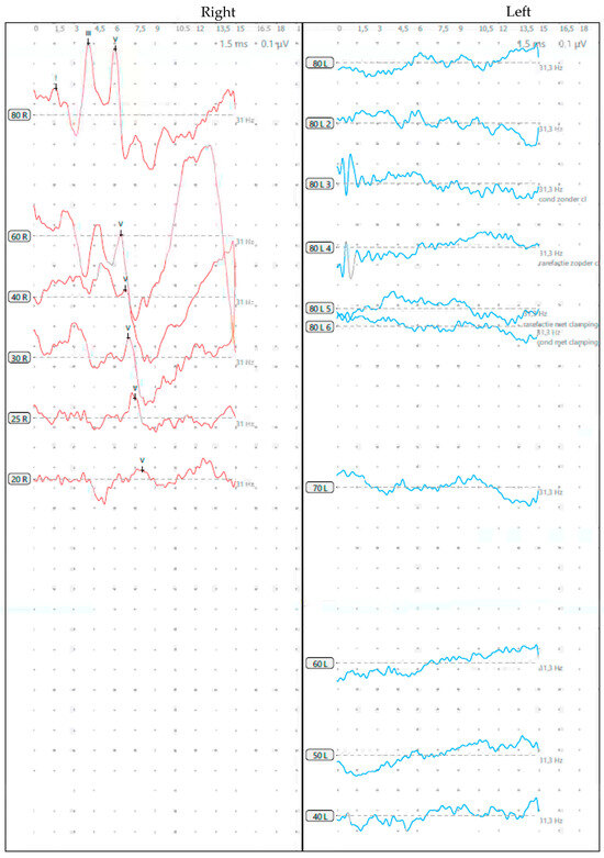 A boy presented shortly after birth with congenital left-sided hearing loss. He was delivered at 36 weeks of gestation in an otherwise uncomplicated pregnancy. Clinical ENT examination was normal, and no dysmorphic features were observed. ABR following a referral from neonatal hearing screening revealed an absent threshold at 80dBnHL on the left and a normal hearing threshold of 25dBnHL on the right (Figure 3). Otoacoustic emissions were present on the right but absent on the left side. Vestibular examination showed bilaterally normal function of the anterior semicircular canals and bilaterally significantly reduced function of the posterior and horizontal semicircular canals, evaluated by video head impulse test [vHIT]. Cervical Vestibular Evoked Myogenic Potential [cVEMP] and ocular Vestibular Evoked Myogenic Potential [oVEMP] showed bilateral reproducible responses with symmetrical and normal amplitude.