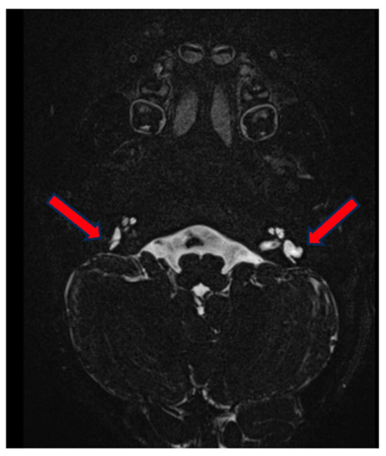 MRI of the inner ear for case 3, T2 tse3d weighted image, hypo-/dysplastic lateral semicircular canals bilaterally (red arrows).