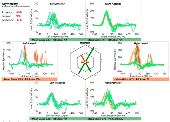 Video Head Impulse Test (vHIT) of the three left and right semicircular canals. The blue and orange lines indicate head movement on the left and right side of the head, respectively, in relation to its accompanied eye movement (green lines) as part of the vestibulo–ocular reflex. Results are quantified as ‘mean gains’. A perfect VOR gain is a gain of 1.0 (eye movement is exactly equal and opposite to head movements), while a VOR gain lower than 0.80 has been proposed as the cut-point between normal and abnormally low VOR gain. The vHIT from case 3 demonstrates only preserved function of the right anterior and both posterior semicircular canals.