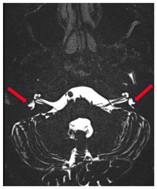 MRI of the inner ear for case 2, T2 tse3d weighted image, dysplasia of lateral semicircular canals (red arrows).