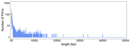 To explore the role of structural variations in the improvement of cultivated rice distributed in Asia, we downloaded the whole-genome sequencing data of 148 rice varieties from the 3K database, including 109 indica and 39 japonica varieties (Table S1). Reads from all rice varieties were aligned to the Nipponbare (IRGSP1.0) genome. Due to the short reads of the sequencing data and the complexity of the structural variations found, we selected two software, Manta (v1.6.0) and Delly (v0.8.7), to call structural variations, focusing only on deletions and insertions (presence/absence variations (PAVs)). We assessed the coverage and sequencing depth of the resequencing data for rice varieties, revealing an average sequencing depth of 14× (5.22–32.64×) and an average coverage of 91.51% (83.2–98.7%) (Table S2). A total of 33,220 PAVs were called, including 32,237 deletions and 983 insertions. Furthermore, an analysis of the PAVs’ distribution in terms of size revealed that the number of variations decreased gradually as the length of the PAVs increased (Figure 1). Short PAVs (50–1000 bp) accounted for 74.6%, indicating that short PAVs may play a predominant role in the improvement of rice cultivars.