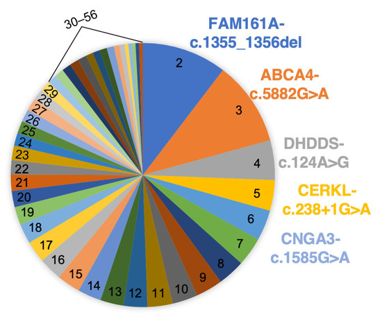 - Hanany, M.; Rivolta, C.; Sharon, D. Worldwide carrier frequency and genetic prevalence of autosomal recessive inherited retinal diseases. Proc. Natl. Acad. Sci. USA 2020, 117, 2710–2716. [Google Scholar] [CrossRef] [PubMed]
