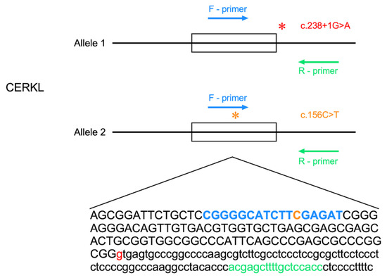 A polymorphism within the primer sequence affecting NGS results in the CERKL gene. In blue and green, the forward and revers primers, respectively. In red text and asterisk, the c.238+1G>A CERKL mutation. In orange text and asterisk, the c.156C>T polymorphism is located within the forward primer sequence.
