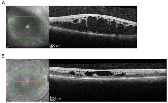 MOL1118-1 is an isolate case who was clinically diagnosed at the age of 27 years with retinoschisis. She complained of nyctalopia starting at the age of 24. Her visual acuity was 0.10 decimal in both eyes (BE), anterior segments within normal limits, clear lens and in fundoscopy, macular schisis in BE was noticed. Full-field ERG analysis revealed a negative pattern in which the a-wave amplitudes (reflecting photoreceptor function) were within the normal limits, while the b-wave amplitudes (reflecting inner retinal function) were reduced. The cone flicker (30Hz) amplitudes were moderately reduced. Horizontal cross-sections of optical coherence tomography (OCT) showed typical retinoschisis, more severe in the left eye (Figure 5). Mutations in the X-linked gene, RS1, are the most common cause of retinoschisis, usually in male patients. CDIP revealed a previously published homozygous mutations, c.932G>A, p.R311Q in the NR2E3 gene. This mutation has been reported as a relatively frequent cause of various IRDs, including RP, enhanced S-cone syndrome (ESCS), Goldmann–Favre syndrome, and clumped pigmentary retinal degeneration (CPRD). In a few cases, NR2E3 mutations were also described in patients with retinoschisis [14,15,16].