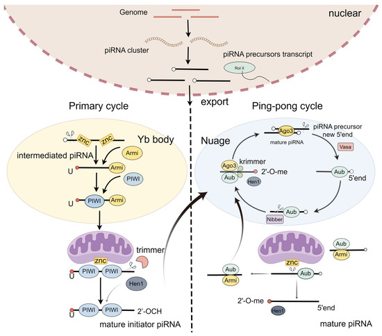 PiRNA biogenesis is a multistep process starting with transcription and the early processing of precursor RNA in the nucleus, export, and precursor cleavage, followed by processing to mature piRNAs and loading into PIWI proteins [29]. It includes two steps: the primary loop and the ping-pong loop (Figure 1) [30,31].