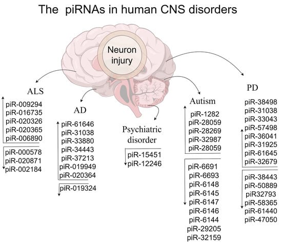 Exhibiting neuron degeneration in specific brain areas, neurodegenerative disorders are a class of pathological conditions that cause a lack of motor coordination and cognitive and memory impairment [134,135,136]. Several well-designed reviews have highlighted the dysregulation of the piRNA pathways in Alzheimer’s disease (AD), Parkinson’s disease (PD), and amyotrophic lateral sclerosis (ALS) [24,26,137]. To enhance understanding, we summarize the potential mechanisms of piRNAs/PIWI in both animal models and patients with neurodegenerative diseases (Table 2 and Figure 2).
