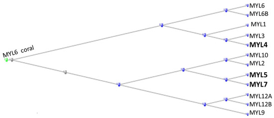 The light chain myosins have 12 representatives in the human genome with HGNC symbols beginning with MYL. Figure 2 depicts a phylogram of these proteins, rooted at the annotation of the coral ortholog of MYL6.