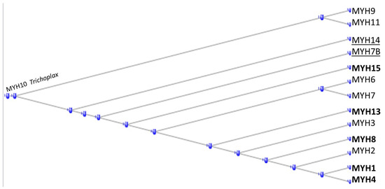 MYH14 and MYH7B (underlined) appeared only with the fish but the tunicates had contributed a substantial portion of the earlier orthologs.