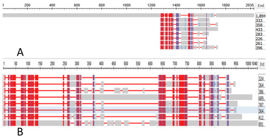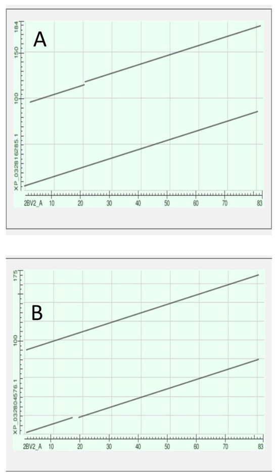(A) depicts the alignment of XP_019638343.1, the annotation for the sequence of the titin homolog of Branchiostomata belcheri against the seven tunicate Gap Junction genes listed in Table S1; (B) shows the alignment against the 891 portion of the sequence that spans those of the shorter GAP Junction sequences.