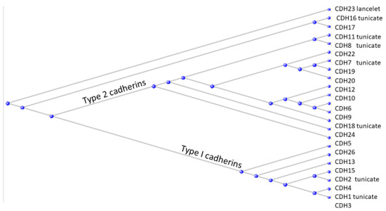 As can be seen, each of the two cadherin types contains proteins (labelled “tunicate”) that have orthologs in the tunicates and might perhaps be considered as founder members of that type. The single cadherin ortholog that derives from the Branchiostomatidae (designated by “lancelet”) lies separate from the cadherins in the two types (I and II).