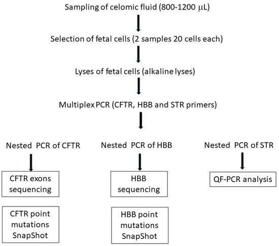 Workflow for analysis of celomatic fluid. Forty fetal cells are isolated by a micromanipulator and equally distributed in two 0.2 mL Eppendorf tubes. Fetal cells are lysed by alkaline procedure. Initially, a multiplex Polymerase chain reaction (PCR) using CFTR, HBB and STR primers is performed. Subsequently, specific nested PCR for CFTR and HBB target regions and STR are separately performed. Sequencing and SnapShot analysis are performed to evaluate the presence of parental mutations. Fragment analysis is used to evaluate the presence of maternal contamination.