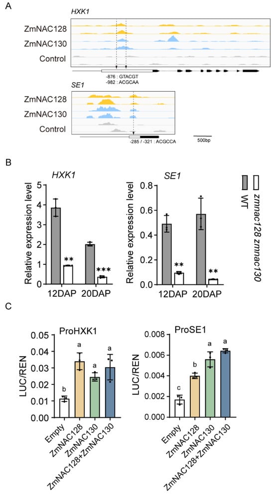 The identification of two carbohydrate metabolism-related genes, HXK1 and SE1, as direct targets of ZmNAC128 and ZmNAC130. (A) DAP-seq analysis shows the binding peaks of ZmNAC128 and ZmNAC130 on these two gene promoters. The cis-elements (‘ACGCAA’ and ‘GTACGT’), which were previously identified [,], are marked by arrows in the promoters. (B) A real-time PCR indicates the relative expression levels of these genes in 12- and 20-DAP endosperms of the zmnac128 zmnac130 mutant compared to those of the WT. The ZmActin was used as a reference gene for normalization, employing the default 100% efficiency setting for detected genes on the CFX Connect real-time PCR system. (C) DLR assays detect LUC activities driven by the promoters in the presence of ZmNAC128, ZmNAC130, or both. Empty, the negative control. The data represent the mean ± standard deviation (SD) of three independent samples (B,C). Significant differences (** p < 0.01 and *** p < 0.001) were determined using a Student’s t-test (B). Different lowercase letters indicate significant differences according to a one-way ANOVA with Tukey’s multiple comparisons test (p < 0.05) (C).