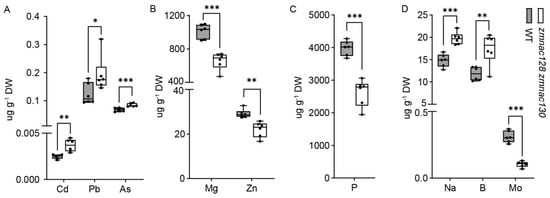 The enrichment of ‘transporters’ in the 243 hdEGs led us to investigate their relationship with ZmNAC128 and ZmNAC130. This category included nine upregulated and eight downregulated transporter genes (Table 1). Among the nine upregulated transporters, six were closely associated with heavy-metal and metalloid (HMM) transport [,,], including one C-type ABC transporter/multidrug resistance protein-related transporter ZmMRPA14, one natural resistance-associated macrophage protein ZmNRAMP5, and four multidrug and toxic compound extrusion transporters (ZmMATE4, ZmMATE11, ZmMATE17, and ZmMATE48). Therefore, we utilized inductively coupled plasma-mass spectrometry (ICP-MS) to measure the levels of various elements in mature kernels of the zmnac128 zmnac130 mutant. In addition to Zn [], the levels of eight other elements were also significantly altered in zmnac128 zmnac130 kernels, including cadmium (Cd), lead (Pb), arsenic (As), boron (B), natrium (Na), phosphorus (P), magnesium (Mg), and molybdenum (Mo) (Figure 3A–D).