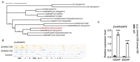 The identification of ZmNRAMP5 as the direct target gene of ZmNAC128 and ZmNAC130. (A) A phylogenetic analysis depicting the relationship among NRAMP proteins from maize, rice, and Arabidopsis. The tree was generated by MEGA11 software using the blastp result of NRAMP protein sequences. Blastp is performed by phytozome v13 and the N-J method is used with 1000 bootstrap. (B) DAP-seq analysis shows the binding peaks of ZmNAC128 and ZmNAC130 on the promoter of ZmNRAMP5. (B) A real-time PCR indicating the relative expression levels of ZmNRAMP5 in 12- and 20-DAP endosperms of the zmnac128 zmnac130 mutant compared to those of the WT. ZmActin was used as a reference gene for normalization. (C) DLR assays detecting LUC activities driven by the ZmNRAMP5 promoter in the presence of ZmNAC128, ZmNAC130, or both. Empty, the negative control. The data represent the mean ± SD of 3 independent samples (B,C). Significant differences (*** p < 0.001) were determined using a Student’s t-test (B). Different lowercase letters indicate significant differences according to a one-way ANOVA with Tukey’s multiple comparisons test (p < 0.05) (C).