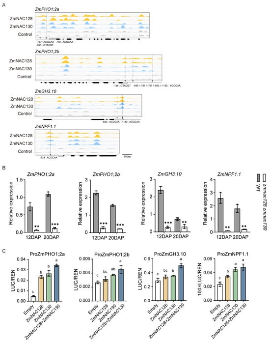 The identification of N-/P-related transporter genes and one JA-Ile synthesis-related gene as the direct targets of ZmNAC128 and ZmNAC130. (A) DAP-seq analysis shows the binding peaks of ZmNAC128 and ZmNAC130 on these four gene promoters. The cis-elements (‘ACGCAA’ and ‘GTACGT’), which were previously identified [,], are marked by arrows in the promoters. (B) A real-time PCR indicates the relative expression levels of these four genes in 12- and 20-DAP endosperms of the zmnac128 zmnac130 mutant compared to those of the WT. ZmActin was used as a reference gene for normalization. (C) DLR assays detect LUC activities driven by the promoters in the presence of ZmNAC128, ZmNAC130, or both. Empty represents the negative control. The data represent the mean ± SD of 3 independent samples (B,C). Significant differences (** p < 0.01 and *** p < 0.001) were determined using a Student’s t-test (B). Different lowercase letters indicate significant differences according to a one-way ANOVA with Tukey’s multiple comparisons test (p < 0.05) (C).