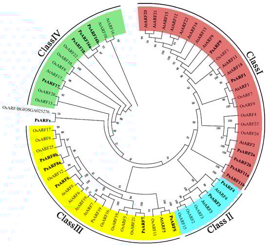 To reveal the evolutionary relationships of tree peony PsARF genes, the PsARF protein sequences and the sequences of 46 ARF proteins in A. thaliana and rice were used to construct a phylogenetic tree (Figure 1). Eighteen PsARF genes were divided into four classes (Classes I, II, III, and IV), with each class consisting of AtARF, OsARF, and PsARF genes. However, the PsARF genes were significantly more closely related to A. thaliana ARF genes than to rice ARF genes. Similar to the rice gene OsARFx/BGIOSGA025276, PsARFx was clustered in a branch separate from the other A. thaliana and rice ARF genes, suggesting the functions of the proteins encoded by these two genes differ from those of the other ARF proteins. Class I was the largest, with 12 AtARF, 6 OsARF, and 6 PsARF genes, but these genes likely evolved relatively independently. Notably, AtARF12–15 and AtARF20–22 as well as PsARF11a and PsARF11b were clustered together, separate from the other ARF genes, with no highly homologous sequences detected. Class II included two pairs of A. thaliana and tree peony ARF genes (i.e., orthologs). In contrast, Classes III and IV included both orthologous and paralogous pairs of A. thaliana and tree peony ARF genes, with relatively diverse evolutionary patterns.