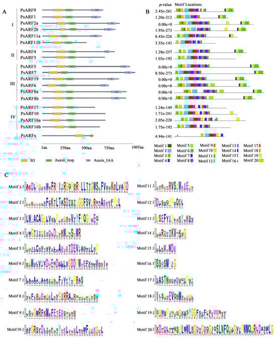 According to the conserved domain analysis (Figure 2A), most of the PsARF proteins contained the B3, Auxin_resp, and Aux/IAA3 domains. All of the Class III proteins included the B3, Auxin_resp, and Aux/IAA3 domains. These domains were also detected in the proteins in Class I, except for PsARF11b, which lacked the C-terminal Aux/IAA domain. All of the Class IV proteins lacked the C-terminal Aux/IAA domain but contained the B3 and ARF domains. Similarly, PsARFx also contained only the B3 and Auxin_resp domains. Further analyses of the conserved motifs in PsARF proteins (Figure 2B) revealed differences in the types and number of motifs among PsARF sequences, which may reflect the functional diversity of these proteins. The B3 domain consists of motifs 1, 2, 8, and 12; the Auxin_resp domain consists of motifs 4, 7, 9, 13, and 15; and the Aux/IAA domain consists of motifs 6, 10, and 14. The Auxin_resp domain of PsARFx contained motif 7 but lacked motifs 4, 9, 13, and 15, which may explain why PsARFx was included in a separate branch of the phylogenetic tree. The amino acid sequences of each motif (Figure 2C) confirmed that the domains B3, Auxin_resp, and Aux/IAA were highly conserved, as were several amino acid sites in the domains.
