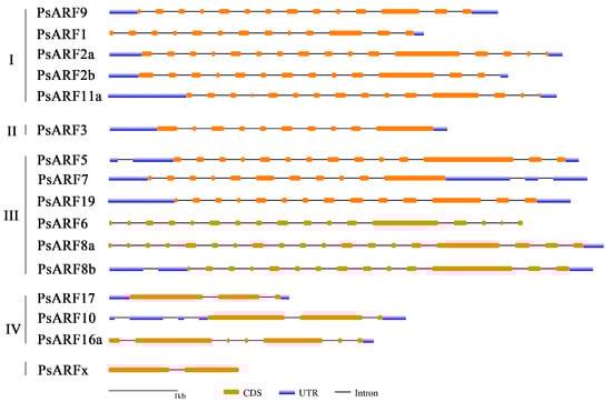 The structures of 16 PsARF genes in Paeonia ostii [] were analyzed on the basis of the available PsARF gene annotation information (Figure 3). All 16 PsARF genes contained exons and introns, with similar exon–intron structures in the PsARF genes belonging to the same class. The number of exons varied between PsARF genes in different classes. Specifically, Class I genes had 13–16 exons, Class II genes had 10 exons, Class III genes had 11–19 exons, and Class IV genes had 3–7 exons. The PsARFx gene contained only two exons and no predicted untranslated region. These results suggest that structural differences among PsARF genes may be associated with their functional diversity.