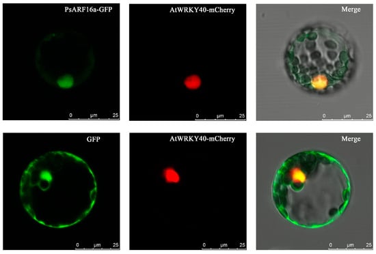 Transient expression and subcellular localization of PsARF16a-GFP. p221-AtWRKY40-mCherry is a nuclear localization marker that was included in the co-transfection of A. thaliana mesophyll protoplasts for the transient expression analysis. Fluorescence was detected using a Leica fluorescence microscope. The merged GFP (green) and mCherry (red) signals suggest that PsARF16a was localized in the nucleus. Bar = 25 µm.