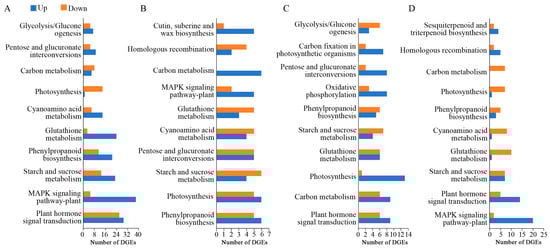 The comparison between the control and samples transiently expressing PsARF16a revealed 1644, 605, 881, and 692 DEGs at 24, 36, 48, and 60 h, respectively, with more up-regulated genes than down-regulated genes at all time points. This suggested that many genes in the leaves were involved in a stress response, with significant changes to their expression levels following the transient expression of PsARF16a. The number of DEGs was highest at 24 h. Notably, the number of DEGs decreased significantly after 36 h, which indicated that most of metabolic activities in the leaves recovered and stabilized. The significantly enriched KEGG metabolic pathways among the DEGs included the following: plant hormone signal transduction, MAPK signaling pathway-plant, starch and sucrose metabolism, phenylpropanoid biosynthesis, glutathione metabolism, and carbon metabolism (Figure 5). These results may reflect the importance of the regulatory effects of PsARF16a on these metabolic pathways.