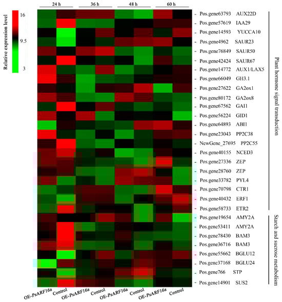 Heat map of differentially expressed genes associated with plant hormone signal transduction as well as starch and sucrose metabolism. According to the transcriptome analysis, the relative expression levels of various genes at different time points were clustered. OE-PsARF16a represents samples transiently overexpressing PsARF16a. Red and green indicate high and low relative expression levels, respectively.