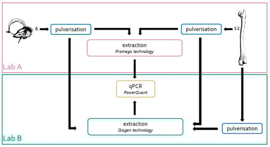 DNA extractions were also carried out in Lab B using the same amount of bone powder (0.5 g) and the Qiagen technology and protocols described by Zupanič Pajnič [32]. At the end, 18 bone powders prepared in Lab A and 12 bone powders prepared in Lab B were used to compare the DNA extraction efficiencies, as shown in Figure 1.