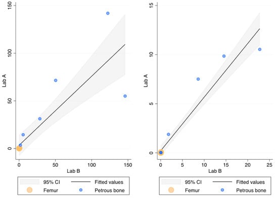 DNA recovery as assessed by the Auto probe (left) and the Deg probe (right) of the PowerQuant kit; x-axis: ng DNA/g bone in Lab B; y-axis: ng DNA/g bone in Lab A.
