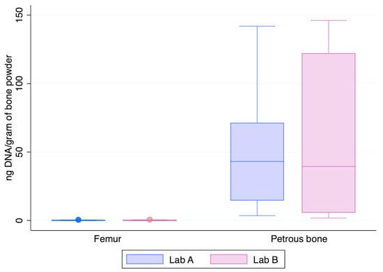 Figure 3 shows the normalised yields of DNA recovered from the two skeletal elements chosen at this step of the study, the femur and the petrous bone. The petrous bones yielded—on average—about 182-fold higher amounts of DNA than the femurs (median values: 52.9 ng vs. 0.143 ng and 59.1 ng vs. 0.150 ng in Lab A and Lab B, respectively). Higher recoveries from petrous bones are perfectly in agreement with previous data showing that those skeletal elements represent the best source of DNA from human bones [3,14], likely due to their intrinsic anatomical [23] and physiological features [22].