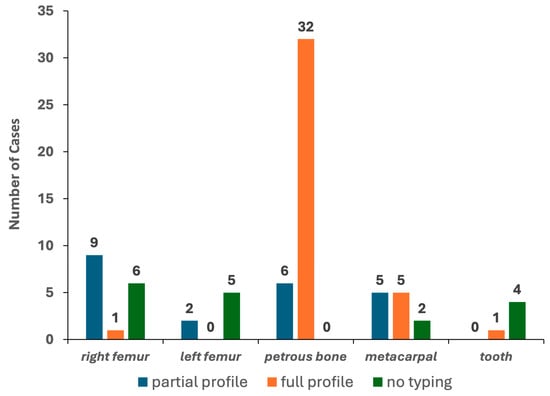 The other bone elements were successfully typed with different rates (from 20% to 83.3% for teeth and metacarpals, respectively). Only five, one and one full electropherogram was achieved for the metacarpal, tooth and femur, respectively. Partial profiles characterised by 18–20 markers/electropherograms (median values) were obtained in 16 tests, whereas the remaining 17 tests showed 5 markers/electropherograms (median value; min = 0; max = 9) and were then classified, such as “no typing” (see Figure 4). Remarkably, the petrous bone provided the same genotypes in the two PCR replicates for 98.1% of the markers, whereas the other bone types yielded profiles affected by stochastic artefacts in up to 13.9% of the replicates likely originated by high degradation levels and/or low amounts of template used for the PCR amplification [35].