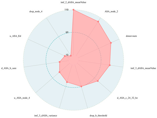Radar chart of features’ importance in the best feature subset. This is a radar plot of the importance of the 11-dimensional subset of the best features filtered by the two-step feature selection. In order to make the results more intuitive, we quantify the importance values of the 11-dimensional best features in the graph, with higher red values indicating greater importance, and it can be seen that the importance of these features for identifying hotspots decreases in a clockwise direction.