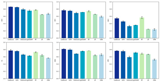 We compared six common feature selection approaches using CatBoost-based classification models, namely mRMR, the SFS, the RF, the SVM-RFE, the mRMR-SFS and the RF-SFS. As shown in Table 5, the PRE and SPE metrics are the best metrics in the model constructed based on the RF-SFS feature selection method, but all other metrics are clearly the highest in the model constructed based on the mRMR-SFS feature selection method, with its AUC even reaching the highest value of 0.859. The mRMR-SFS method first filters a set of features from the total set of features that are most relevant to the sample labels but most irrelevant to each other, after which it ranks them. The SFS method involves iteratively adding subsets of features to optimize model performance. Taken together, we used the mRMR-SFS feature selection method to construct our model.
