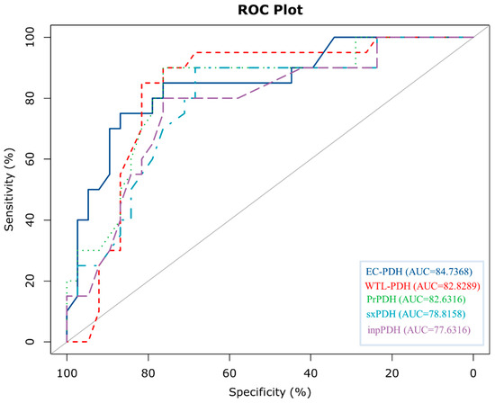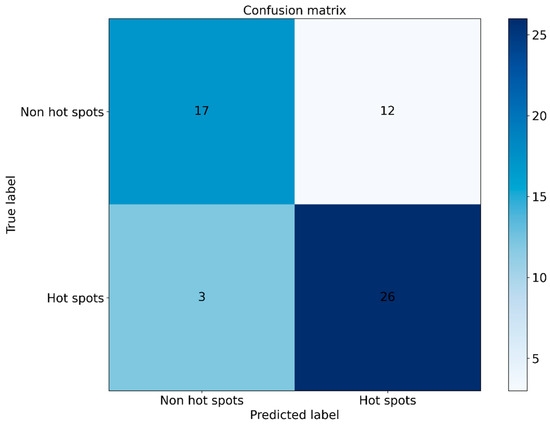 To further evaluate the generalization ability of EC-PDH, we compared it with state-of-the-art methods, including WTL-PDH, PrPDH, sxPDH and inpPDH. Figure 5 shows the ROC curves of the above five methods on the test set. It can be seen that our method, with an AUC = 0.847, has the best prediction performance and generalization ability. Furthermore, we plotted the confusion matrix of EC-PDH for the test set, as shown in Figure 6. For the 58 samples in the test set, our method successfully predicted 43 hot spots and non-hot spots and misidentified 3 hot spots and 12 non-hot spots.