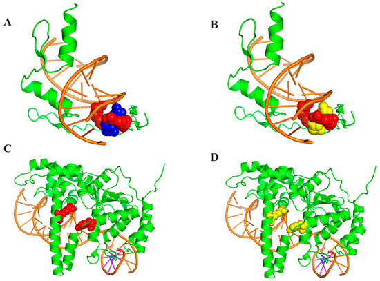 Identified hot and non-hot spots in 1AAY using the EC-PDH (A) and PrPDH (B) methods. The EC-PDH (C) method and PrPDH (D) method were used to identify hot and non-hot spots in 3Q8L. The color scheme chosen is as follows: orange for DNA sequences and green for protein sequences. Red indicates correctly identified hot spot residues and purple indicates correctly identified non-hot spot residues. Yellow indicates residues that were incorrectly predicted (hot and non-hot spots).