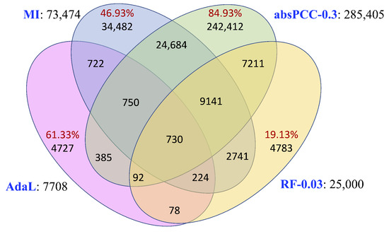 Given the co-expression networks constructed using the four inference methods, we examined their pairwise edge overlaps to ascertain their complementarity or redundancy. Note that here we used the smallest subnetworks of absPCC and RF (i.e., absPCC-0.3 and RF-0.03, respectively) to ensure that the networks included the fewest redundant edges. As presented in Figure 2, 46–85% of the edges are unique to each of the MI, absPCC-0.3, and AdaL networks. The fourth network, RF-0.03, is mostly redundant to the other three networks, i.e., only 19.13% of its edges are unique to it. Yet, only 730 edges are common to all four co-expression networks. Note that the 730 edges involve 1181 nodes, and they form 454 connected components, the largest one of which has 13 nodes and 12 edges. Also, only 2 of the 730 edges overlap with the PPIs by [17] (adjusted p value of 1).