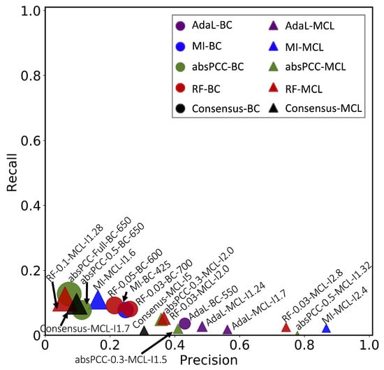 For each of the 11 networks, given two clustering methods and three selected parameter values per clustering method, there are six combinations of a clustering method and parameter value (Table 2). To further simplify the presentation of results, for a given network, we discarded from further consideration any of its considered combinations that had both lower precision and lower recall than another one of the considered combinations for the same network. That is, we continued considering only the best combinations, i.e., those combinations that are superior to all other combinations for the same network with respect to at least one of precision and recall. For details, see Section 4.4 and Supplementary Figures S3–S7. This resulted in the following combinations for further consideration: for the MI network: MCL-I1.6, BC-425, and MCL-I2.4 (Supplementary Figure S3); for the AdaL network: BC-550, MCL-I1.24, and MCL-I1.7 (Supplementary Figure S6); for Consensus: MCL-I1.7 and MCL-I5 (Supplementary Figure S7); over all four thresholded absPCC networks: absPCC-BC-650, abcPSS-0.5-BC-650, absPCC-0.3-MCL-I2, absPCC-0.3-MCL-I1.5, and absPCC-0.5-MCL-I3.2 (Supplementary Figure S4); over all thresholded RF networks: RF-0.1-MCL-I1.28, RF-0.05-BC-600, RF-0.03-BC-700, RF-0.03-MCL-I2, and RF-0.03-MCL-I1.28 (Supplementary Figure S5).
