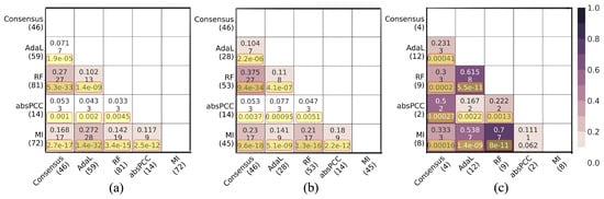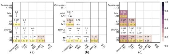 Pairwise overlaps between predictions made by the best combination for each of the five networks with respect to predicted existing associations, i.e., true positives. Panel (a) shows pairwise overlaps of gene–GO term associations. Panel (b) shows pairwise overlaps of unique genes that participate in the predicted gene–GO term associations. Panel (c) shows pairwise overlaps of unique GO terms that participate in the predicted gene–GO term associations. Within each panel, the number in parentheses below each network name is the number of corresponding true positives. Within each cell, there are three numbers; the first number is the Jaccard index, the second number is the raw number of the predictions in the given overlap, and the third number is the adjusted p value resulting from the hypergeometric test. The yellow boxes highlight the adjusted p values that are statistically significant.