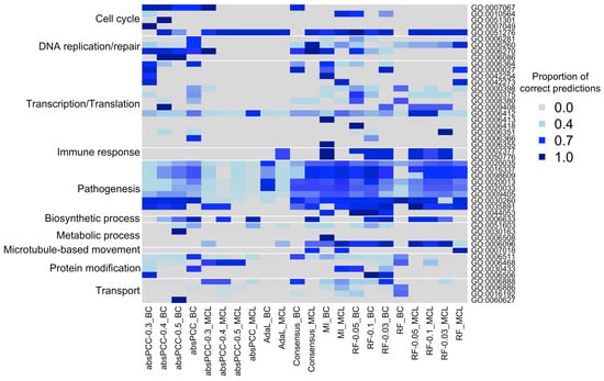 GO terms and biological process categories captured by the different combinations of a network and clustering method. Columns correspond to the different combinations. Rows correspond to GO terms that are captured by predicted gene–GO term associations, where the GO terms are then grouped into biological process categories (shown on the left). We visualize the number of gene–GO term associations predicted by a given combination divided by the total number of true positives predicted over all combinations. That is, each cell shows, for a given GO term, the proportion of true positives from the union of all combinations that are predicted by a given combination. The darker blues represent higher proportion values.