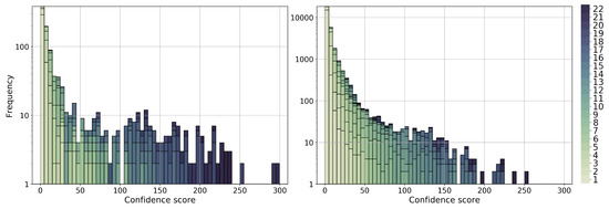 Next, we aim to supplement the limited functional annotation data in the P. falciparum genome. Again, here, we deal with the 22 combinations of a network and clustering method, with up to three clustering parameter values for each combination. For each of the 22 combinations, for each gene–GO term association predicted by a given combination, and given up to three adjusted p values for a given prediction (corresponding to up to three clustering parameter values), we selected the lowest adjusted p value for the prediction. Then, we assigned a confidence score to each gene–GO term prediction made by at least one of the 22 combinations of a network and clustering method and provided the list of all associations ranked by their confidence scores. Intuitively, the more combinations that support a predicted gene–GO term association and the more strongly that a given combination supports a prediction (i.e., the lower the corresponding selected adjusted p value), the higher the confidence score of the prediction (see Section 4.6). We provide two ranked gene–GO term association lists: one for the existing associations with 1062 such associations (Additional File S1) and the other for the novel associations with 28,826 such associations (Additional File S2). For the distribution of the confidence scores, see Figure 7.