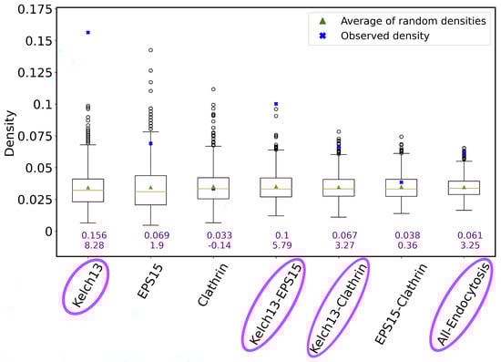 The connectivity of genes in a given list/set (or simply group) compared to the genes’ connectivity expected by chance. The x axis shows the considered endocytosis-related gene groups. The y axis corresponds to connectivity as measured by network density (for a gene group of size n, where there exist e edges between the n genes, and the density is the ratio of e and , where the latter is the total possible number of edges between n nodes). The boxplot for a given gene group represents the density distribution of 1000 random runs for that group. In particular, if a given gene group has n genes, the connectivity by chance is measured by calculating the density of a subnetwork consisting of randomly selected n genes and their edges from the Consensus network. The green triangle in each boxplot/for each group is the average density of the 1000 randomly selected subgraphs. The orange line is the median of the 1000 random densities. The blue cross point is the actual (observed) density of the given gene group, whose numerical value is also shown as the top purple number below the given boxplot. The other (bottom) purple number below the given boxplot is the z score of the observed density when contrasted against the random densities. The names of endocytosis-related gene groups that are shown in pink ovals correspond to those groups that are significantly more densely connected than at random).