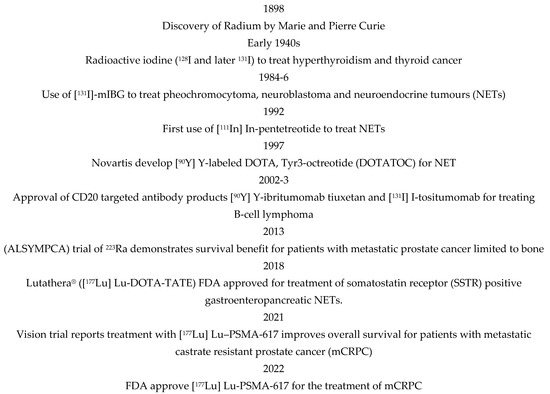 Notable dates in the application of molecular radiotherapy (MRT).