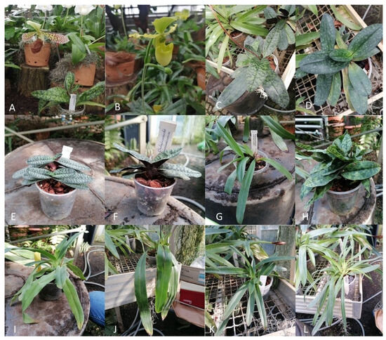 Examined species of Paphiopedilum. (A) Paphiopedilum sukhakulii subg. Sigmatopetalum; (B) Paphiopedilum primulinum flavum subg. Cochlopetalum; (C) Paphiopedilum sukhakulii subg. Sigmatopetalum; (D) Paphiopedilum niveum subg. Brachypetalum; (E) Paphiopedilum micranthum subg. Parvisepalum; (F) Paphiopedilum malipoense subg. Parvisepalum; (G) Paphiopedilum charlesworthii subg. Paphiopedilum; (H) Paphiopedilum jackii subg. Parvisepalum; (I) Paphiopedilum primulinum flavum subg. Cochlopetalum; (J) Paphiopedilum spicerianum subg. Paphiopedilum; (K) Paphiopedilum villosum subg. Paphiopedilum; (L) Paphiopedilum henryanum subg. Paphiopedilum.