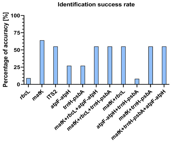 Similar results were obtained by several other research groups [58,59]. It has been concluded that the rate of successful taxonomic identification is low in species rich clades [8]. The low effectiveness of taxonomic identification using a single barcode locus was already noticed at the beginning of the application of this method in botanical analyses. In this study, different combinations of two and three markers were used, most of which were effective in 55% of cases. The exception was multilocus atpF-atpH + trnH-psbA, which provided only 8% correct matches. The efficacy of species verification using the combination of matK + rbcL locus was 55%, and the addition of a third locus (atpF-atpH or trnH-psbA) showed no improvement. Over the course of several years, various research groups have suggested a variety of combinations of diagnostic loci that are effective for species identification. Raskoti and Ale [60] pointed to the combination of the chloroplast and nuclear locus of matK + ITS, while showing that the combination of matK + rbcL exhibits relatively low efficiency in identifying orchid species. In contrast, Kress and Erickson [16] recommended the use of rbcL + trnH-psbA barcodes to identify terrestrial plants.
