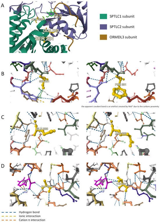 Location of SPTLC1 Ser331, Gln333, and Ala339 residues and Miztli-predicted impact of SPTLC1 p.Ser331Phe, p.Gnl333Arg and p.Ala339Thr variants on the structure and interactions within the SPT enzymatic complex. (A) Location of SPTLC1 Ser331, Gln333, and Ala339 residues at the interface between SPTLC1, SPTLC2,and ORMDL3, and near the PLP binding site. (B) Impact of SPTLC1 p.Ser331Phe variant. (C) Impact of SPTLC1 p.Gln333Arg variant. (D) Impact of SPTLC1 p.Ala339Thr variant.