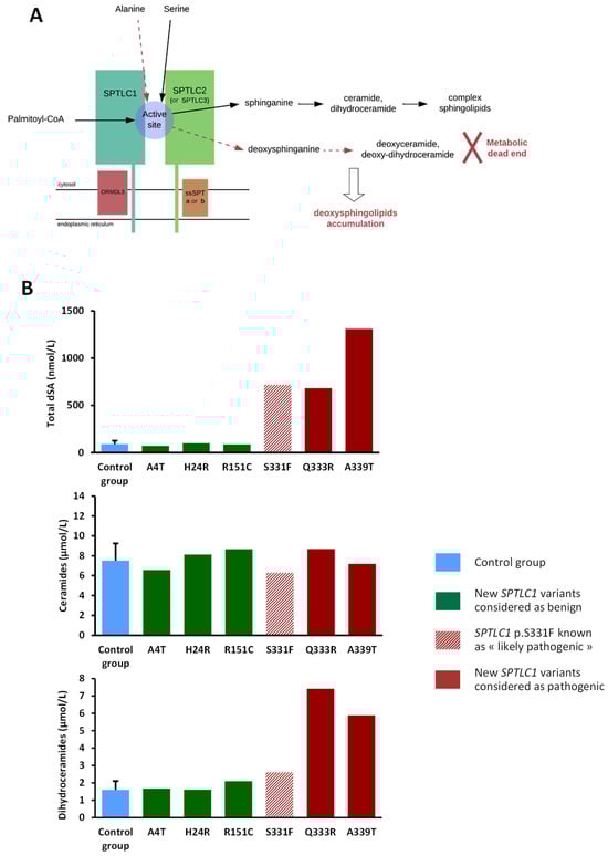 Functional analysis of sphingolipids. (A) Simplified SPT structure and role of the enzyme in de novo sphingolipid and deoxysphingolipid synthesis. (B) Quantification of total dSA, ceramides, and dihydroceramides in plasma samples of patients with SPTLC1 variants in a context of HSAN1 suspicion, and the clinical–biological conclusion according to the results of the functional analysis.