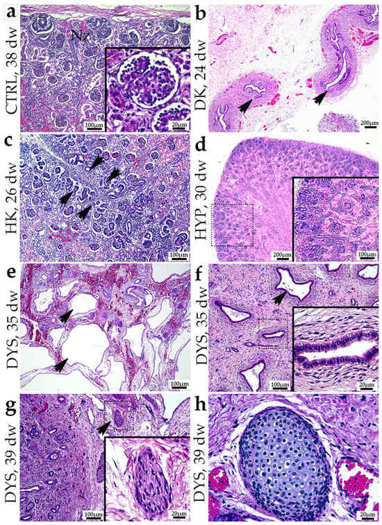 Hematoxylin and eosin images of normal fetal kidney at 38th dw (a) and kidneys affected with congenital anomalies: duplex kidney (DK) at 24th developmental week (dw) (b), horseshoe kidneys (HK) at 26 dw (c), hypoplastic kidneys (HYP) at 30th dw (d), and dysplastic kidney (DYS) at 35 dw (e,f) and 39 dw (g,h) (H&E). The most characteristic elements noticed for each observed phenotype are shown in inserts. A scale bar is indicated on each image.